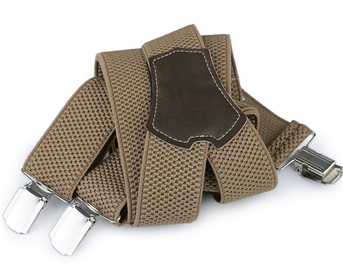 Pánské šle v texturovaném provedení v béžové barvě s nastavitelnou délkou 120 cm, šíře 3,5 cm v provedení ve tvaru písmene "Y" s uchycením na žabky a zadní vsadkou z eko-kůže.