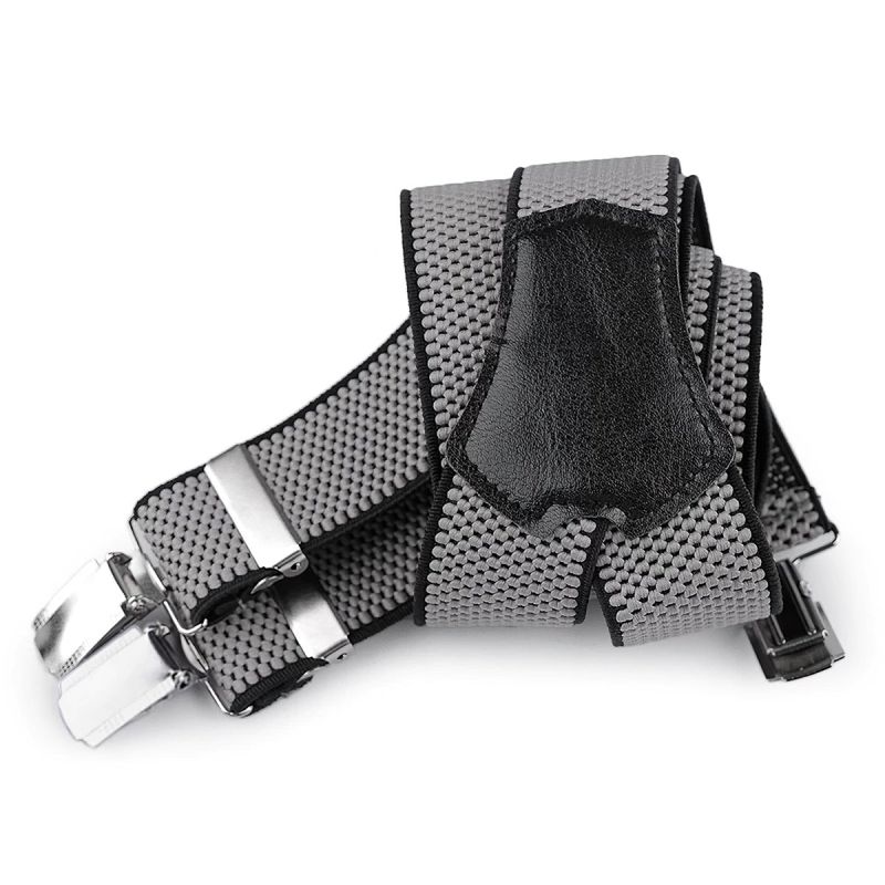 Pánské šle v texturovaném provedení v světle šedé barvě s nastavitelnou délkou 120 cm, šíře 3,5 cm v provedení ve tvaru písmene "Y" s uchycením na žabky a zadní vsadkou z eko-kůže.