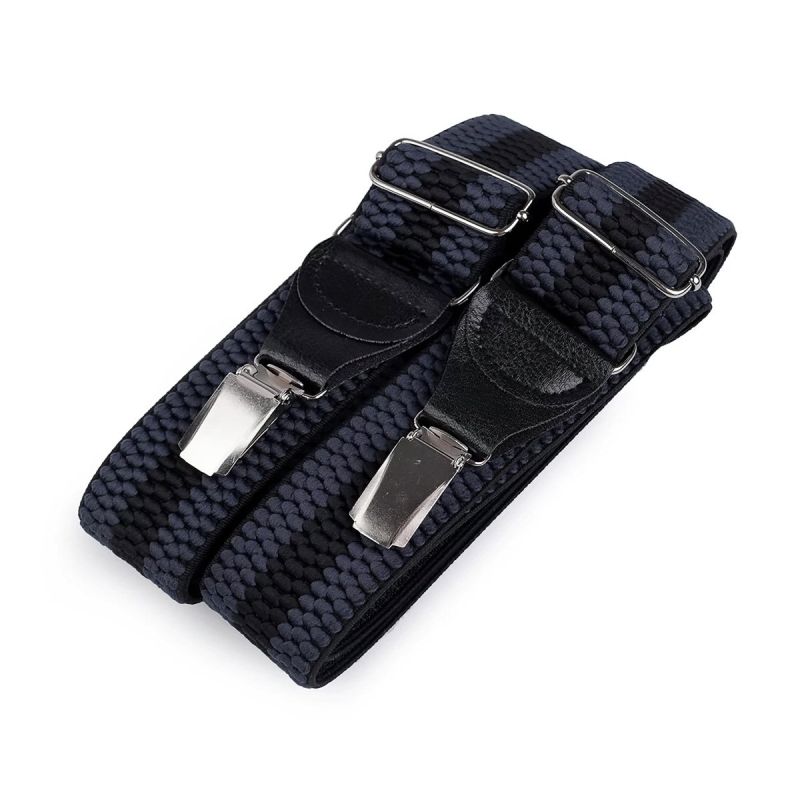 Pánské šle v texturovaném provedení se vzorem pruhů v tmavě modré barvě s nastavitelnou délkou 120 cm, šíře 4 cm v provedení ve tvaru písmene "Y" s uchycením na 4 žabky (2 vepředu, 2 vzadu) a zadní vsadkou a doplňky z eko-kůže. Vhodné pro běžné nošení, hipster styl i pro lyžařské a jiné sportovní kalhoty.