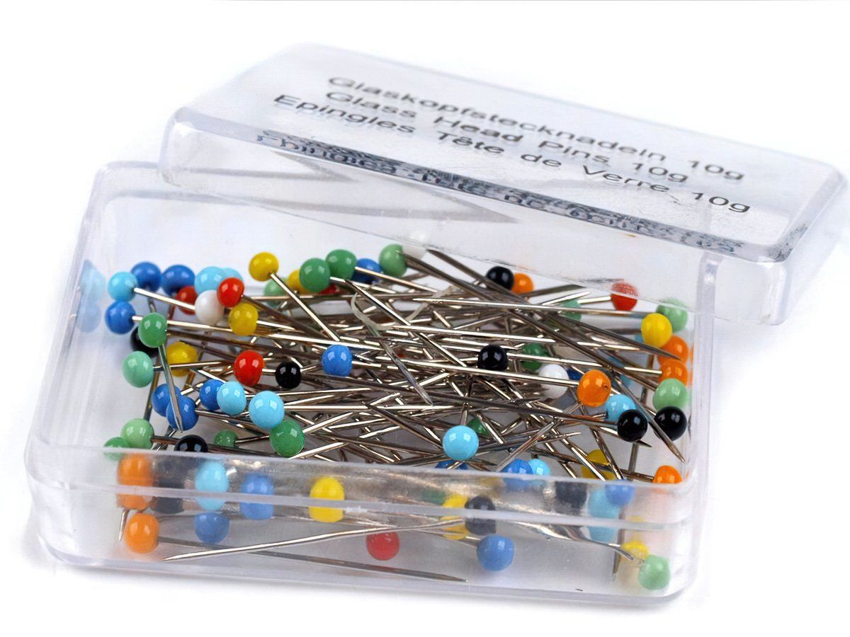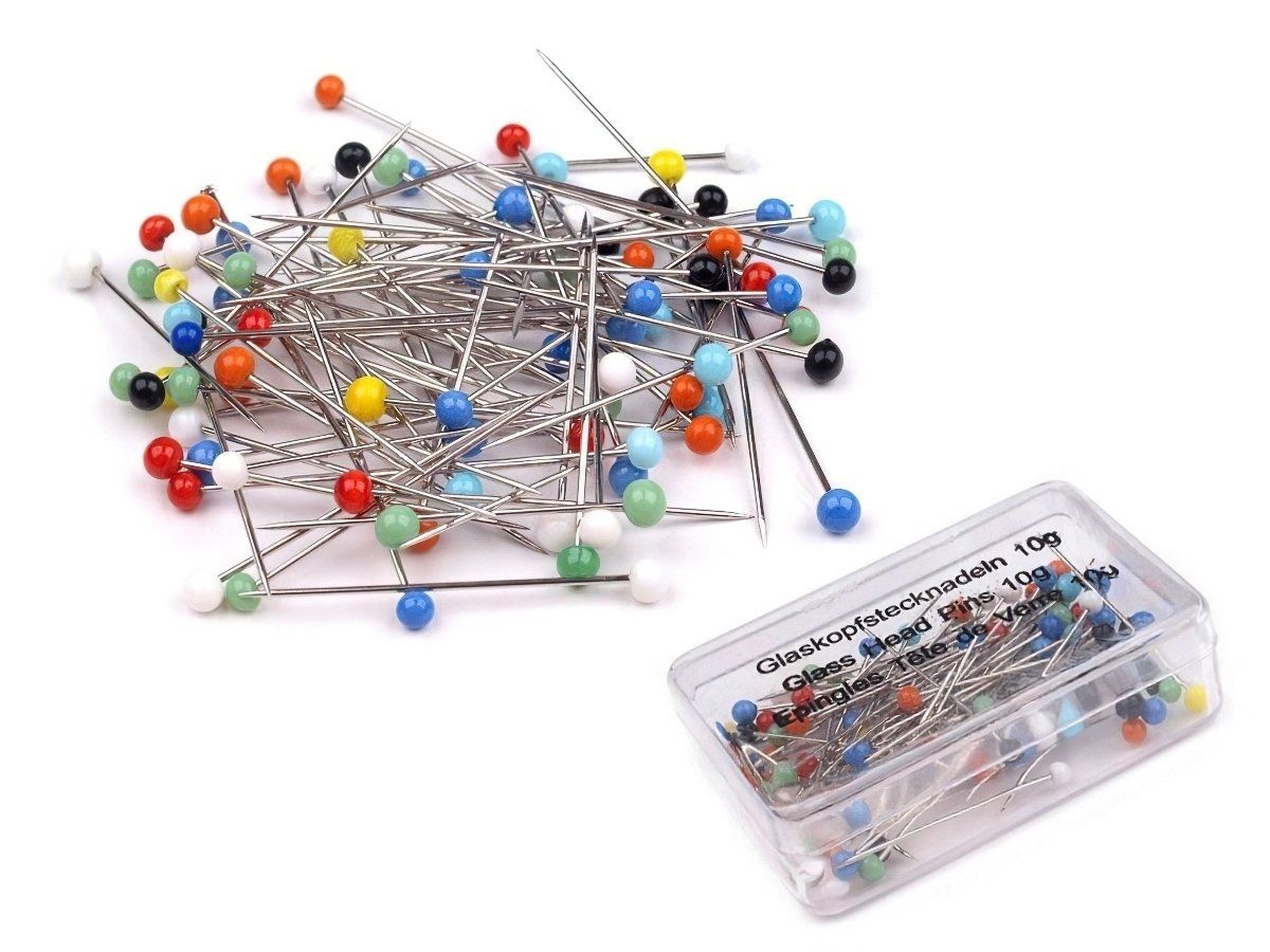 Sada základních špendlíků s barevnými skleněnými hlavičkam. Souprava obsahuje cca 90 kusů špendlíků v o průměru 0,6 mm a délce cca 32 mm, průměr hlavičky je 2,5mm. Silnější špendlíky využijete při krejčovské činnosti i v kanceláři. Špendlíky jsou vyrobeny z magnetického kovu a jsou mírně ohebné.