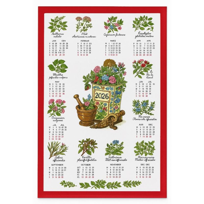 Bavlněný textilní kalendář pro rok 2026 s motivem různých druhů bylinek s červeným okrajem v rozměru 45x65cm. Kalendář poté může sloužit i jako kuchyňská utěrka. Látkový kalendář má jednostranný vzor a je vyroben ze 100% bavlny. Provedení bez hůlky na zavěšení.
