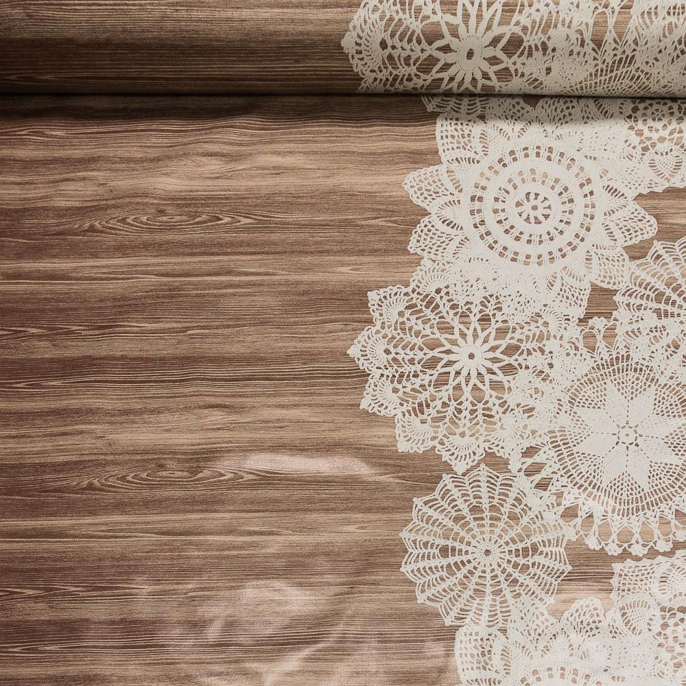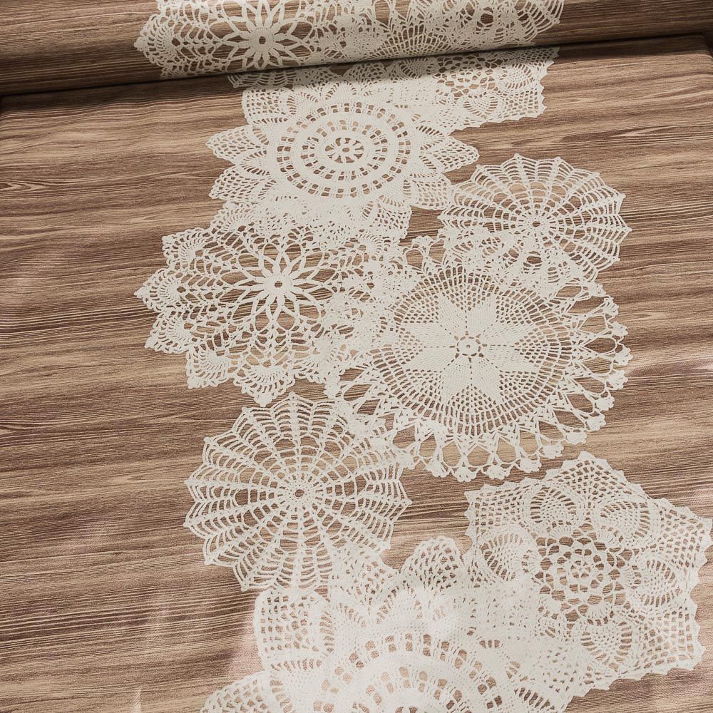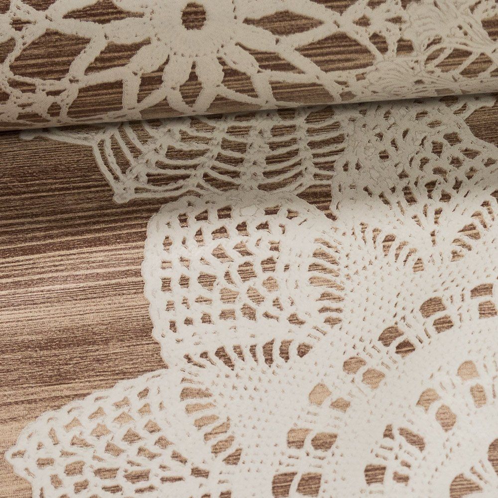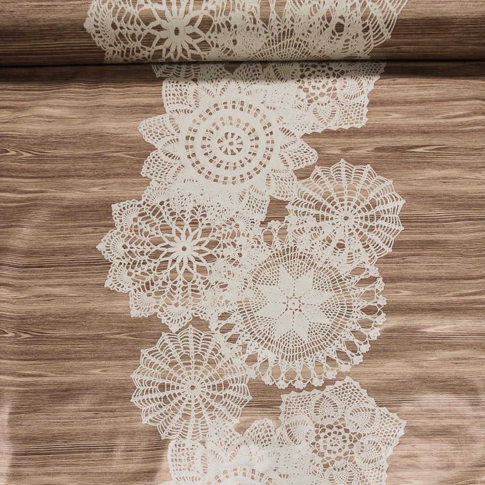 Omyvatelná PVC ubrusovina s podkladem z netkané textilie se vzorem bílých krajek uprostřed šíře ubrusu na béžovém dřevě ...