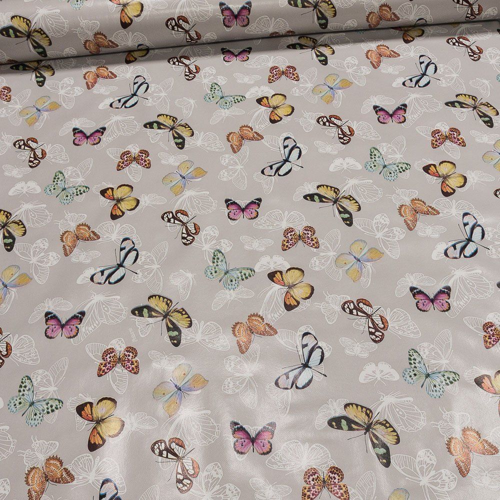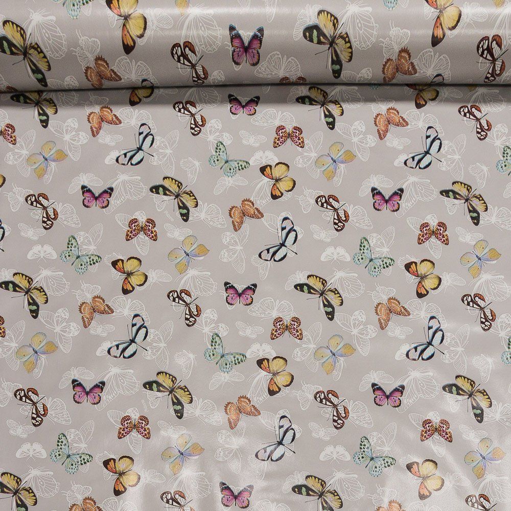 Ubrus PVC s textilním podkladem 607-1, barevní motýli, šedá, š.140cm (metráž)
