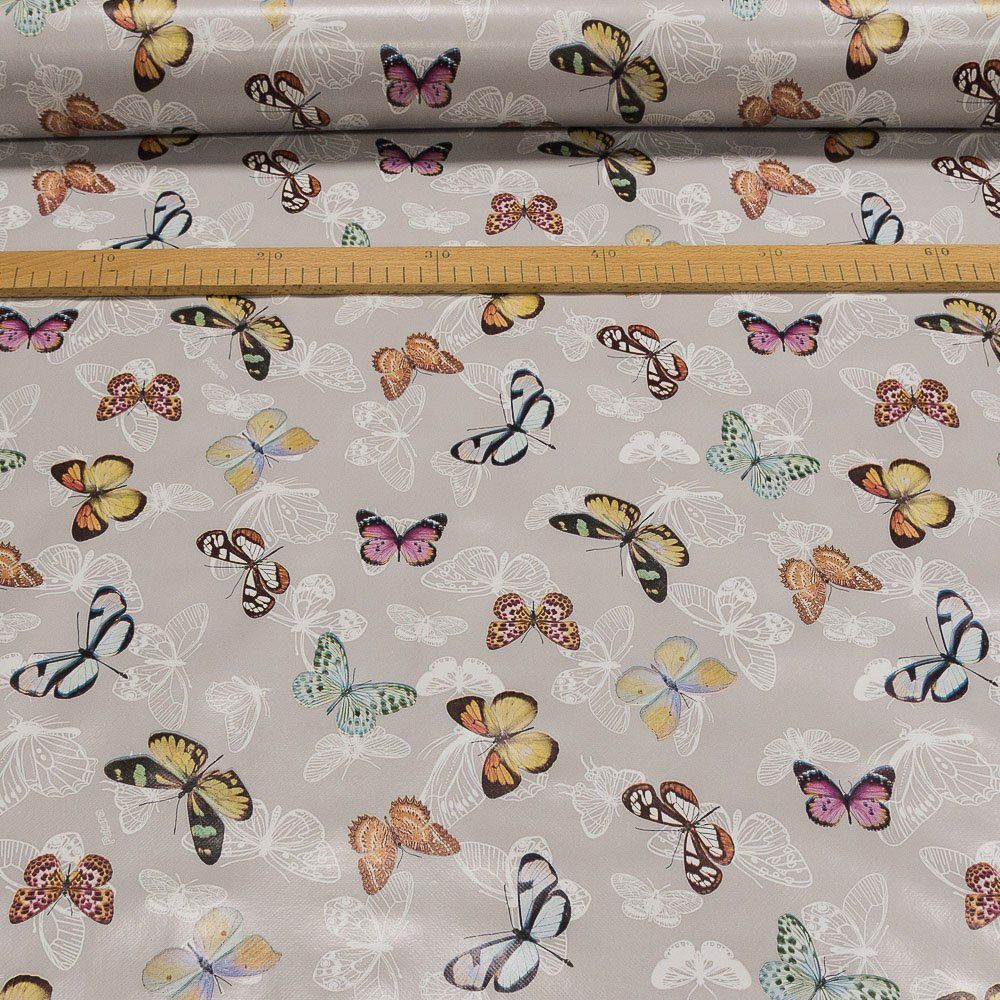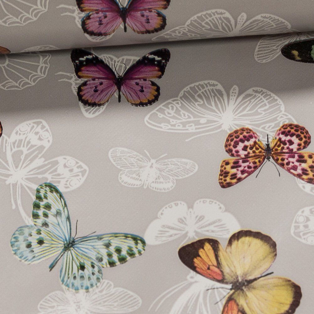 Omyvatelná PVC ubrusovina s podkladem z netkané textilie se vzorem barevných motýlů na šedém podkladu s hladkým povrchem...