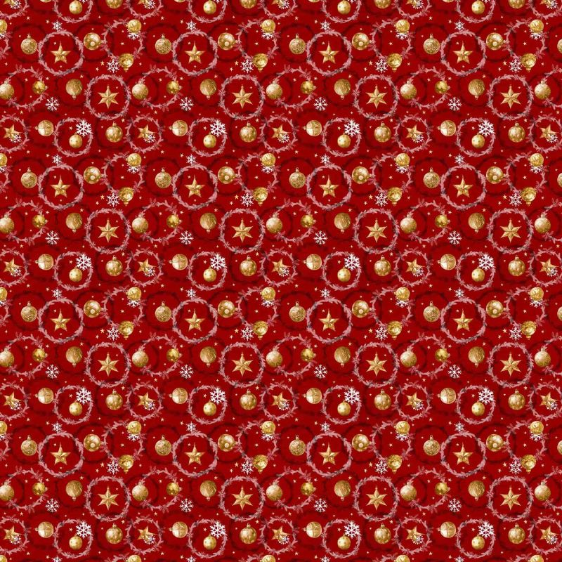 Omyvatelná PVC ubrusovina s podkladem z netkané textilie se vzorem zlatých vánočních ozdob na červeném pozadí s hladkým povrchem. Ubrus je dostupný v metráži o šířce 140cm.