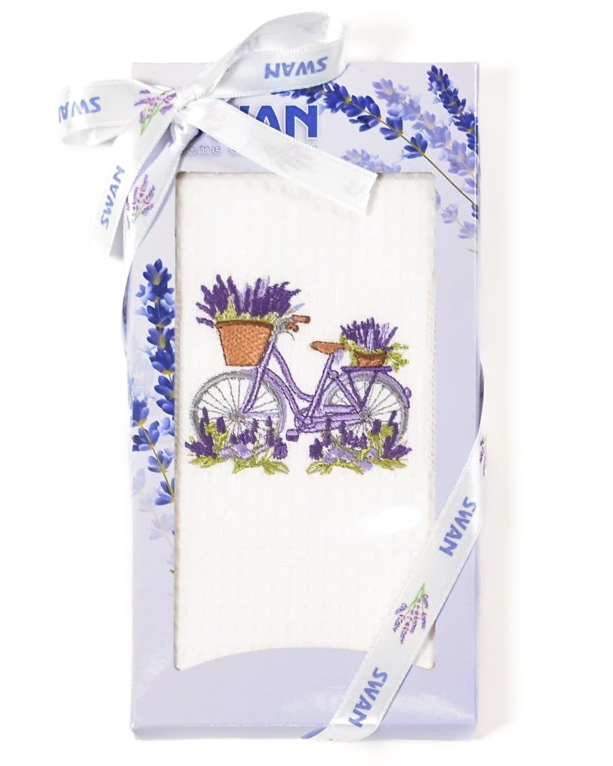 Utěrka SWAN 57 vaflová vyšívaná, dárkové balení, levandule a kolo na bílé, 1 kus 50x70cm