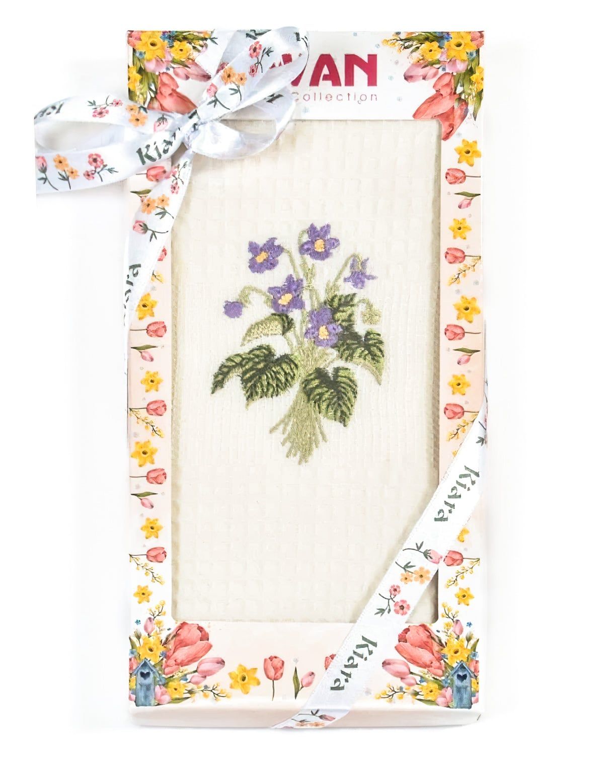 Bavlněná vaflová utěrka s motivem kytičky fialek na smetanovém podkladu v rozměru 50x70cm. Utěrka je balena v ozdobné dárkové krabičce a je vyrobena ze 100% bavlny.