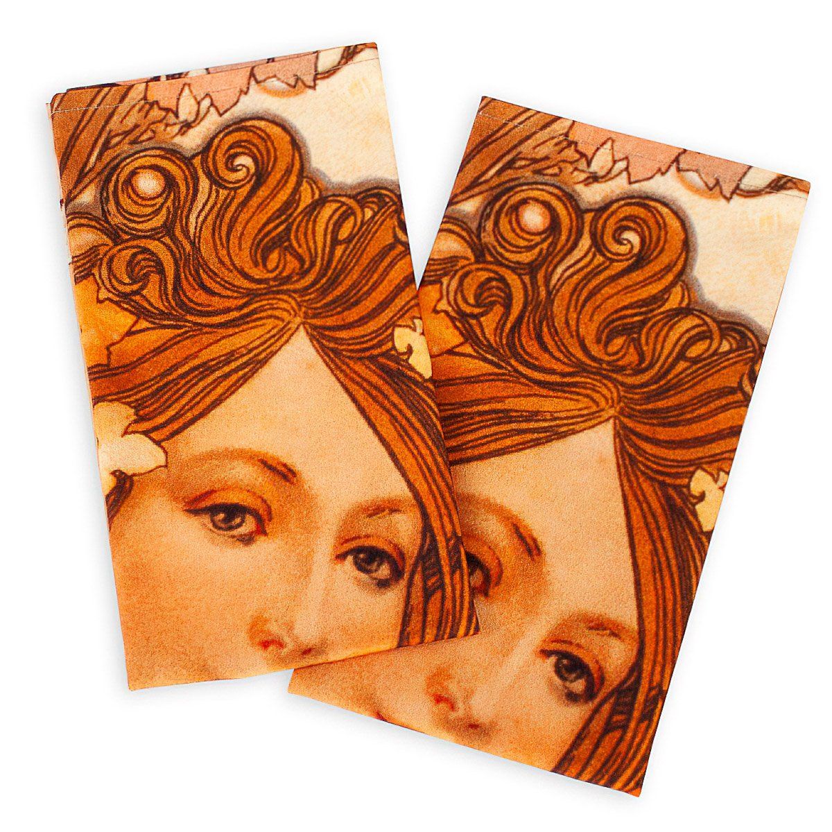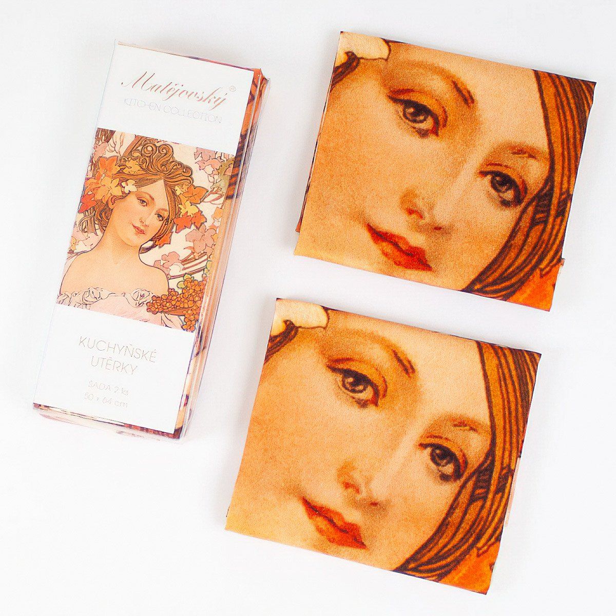 Bavlněné utěrky s motivem typické kresby Alfonse Muchy v oranžovo-béžových odstínech v rozměru 50x64cm. Utěrky mají jednostranný vzor a jsou vyrobeny ze 100% bavlny. Utěrky jsou v dárkovém balení vždy o dvou kusech se stejným vzorem.