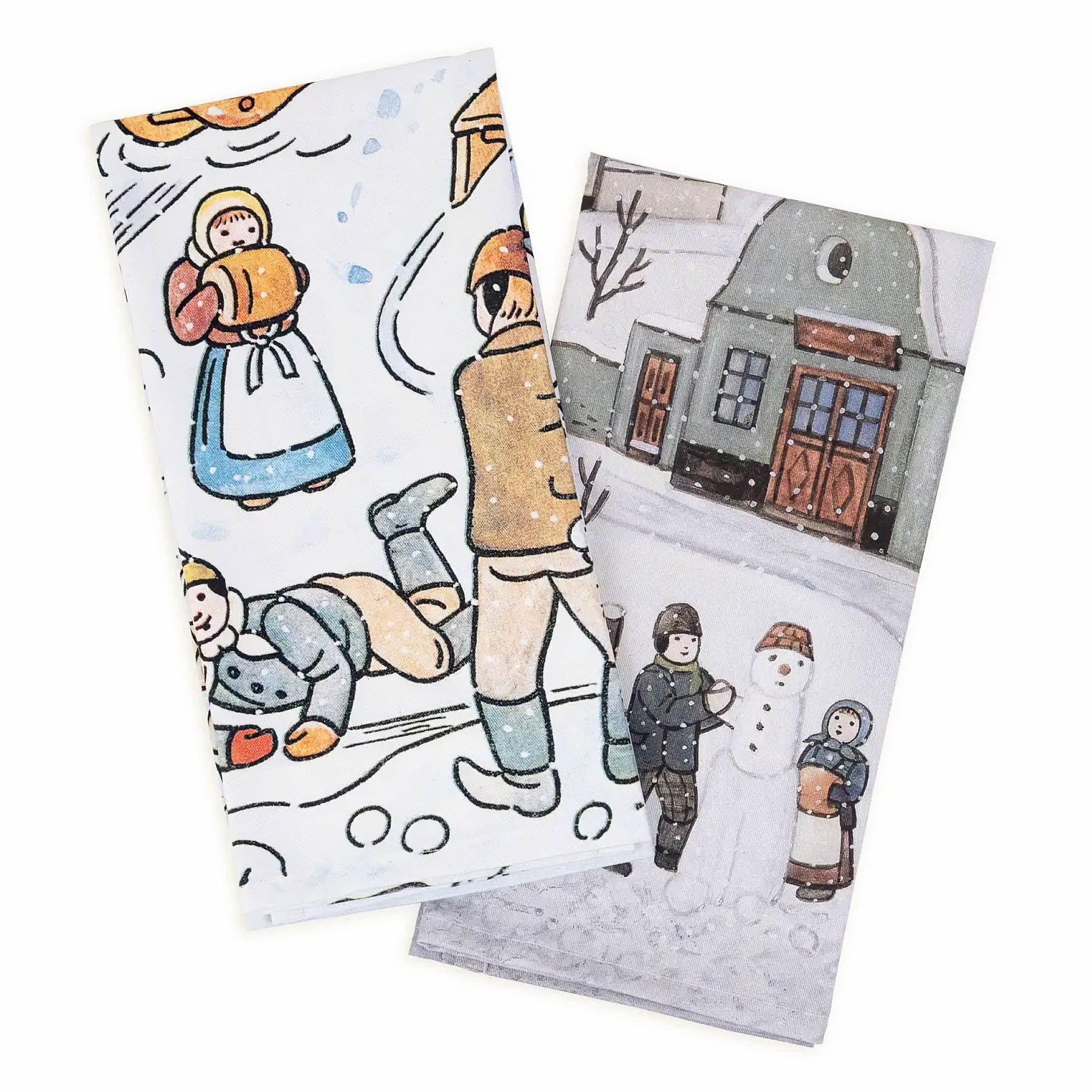 Bavlněné utěrky s kresleným vzorem v typickém ladovském stylu. Utěrky jsou v bílém provedení v rozměru 50x64cm. Utěrky mají jednostranný vzor zimních radovánek a jejích obyvatel užívajících si typickou ladovskou zimu a jsou vyrobeny ze 100% bavlny. Utěrky jsou v dárkovém balení vždy 1x motiv zasněžené vesničky, 1x motiv zimních radovánek.