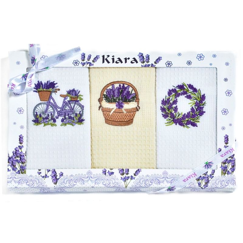 Utěrky KIARA 107 vaflové vyšívané, dárkové balení, levandule kolo košík věnec, smetanová a bílá, 3 kusy 50x70cm