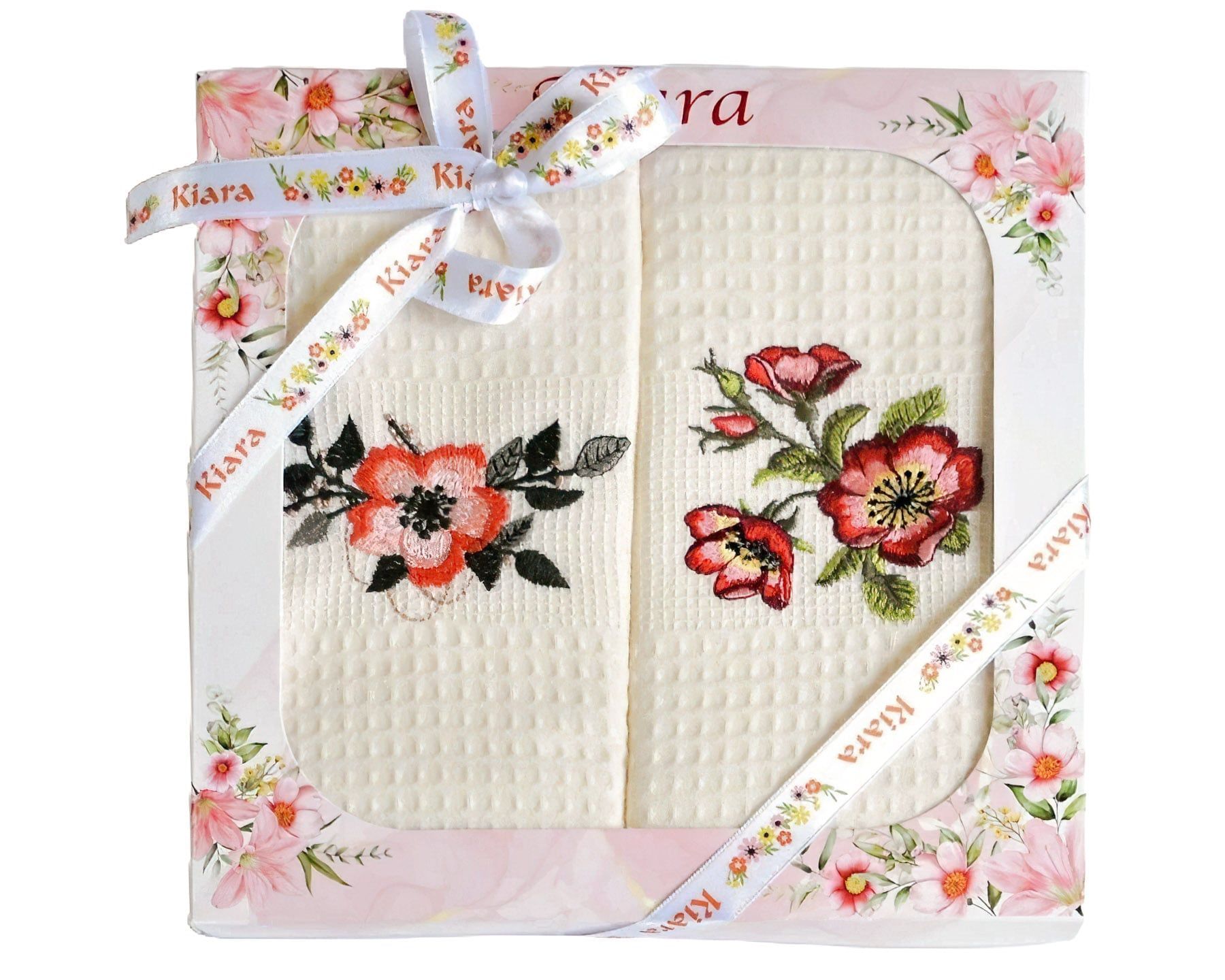 Utěrky KIARA 135 vaflové vyšívané, dárkové balení, šípkové růže na smetanové, 2 kusy 50x70cm