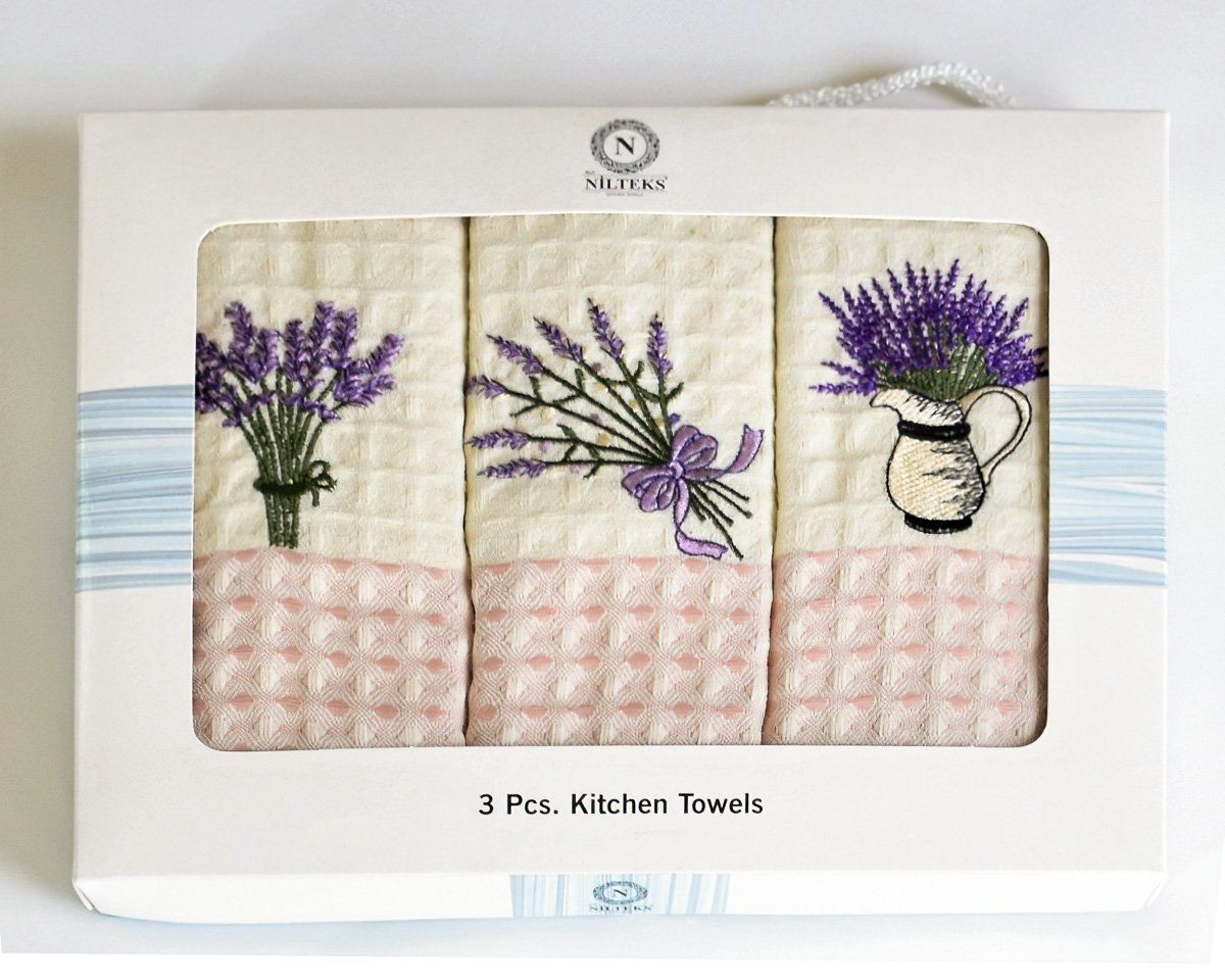 Bavlněné vaflové utěrky s motivem levandule na smetanovo-světle růžovém podkladu. Balení obsahuje 3 kusy utěrek v rozměru 50x70cm. Utěrky jsou baleny v ozdobné dárkové krabičce a jsou vyrobeny ze 100% bavlny.