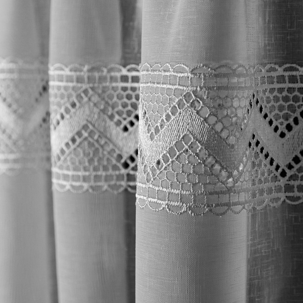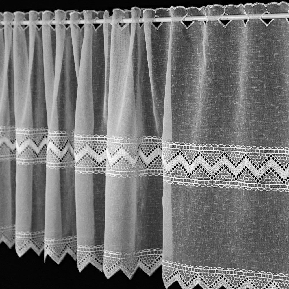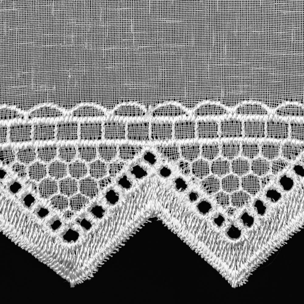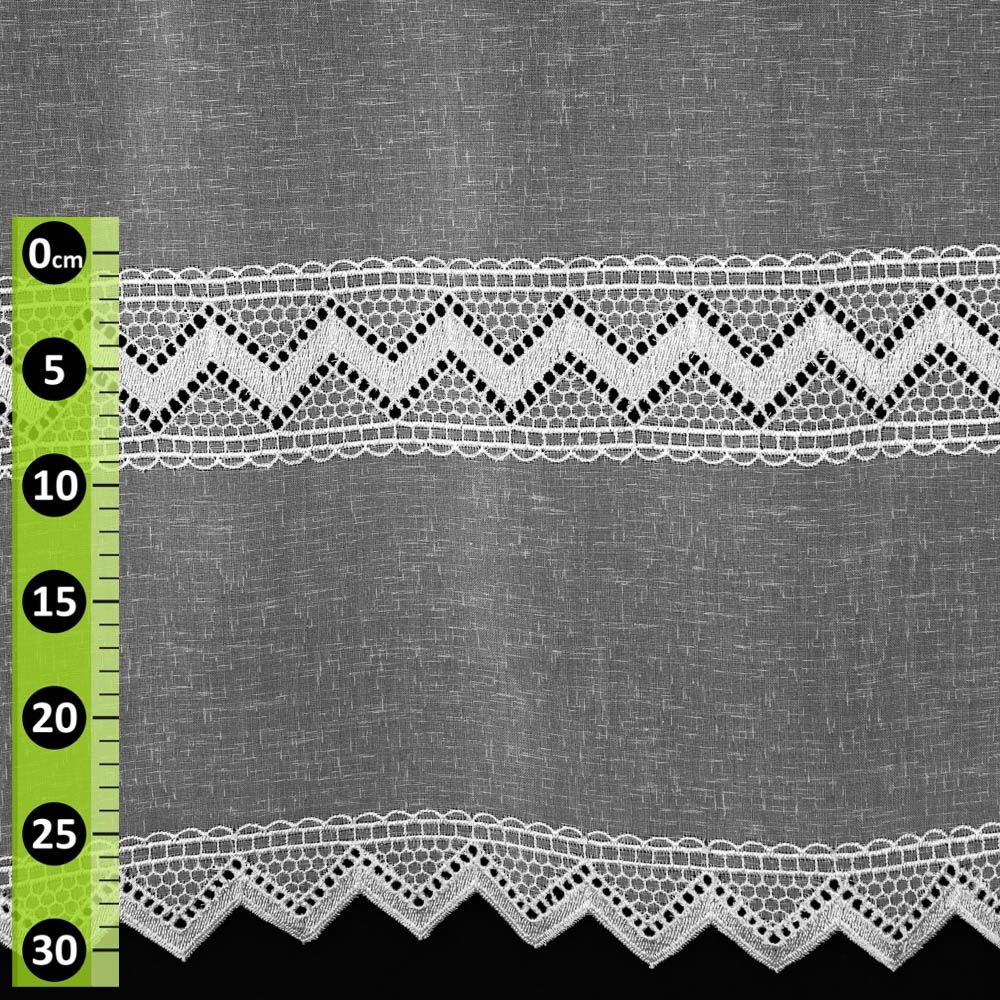 Metrážová batistová vitrážová záclona s bílým motivem vyšívaného proužku se špičatou vlnkou uprostřed na bílém podkladě, s bordurou zakončenou obloučky. Záclona je vyrobena ze 100% polyesteru a je dostupná v různých výškách. Výška záclony je měřena v nejdelším místě. Šířku záclony zadejte do kolonky "Množství"