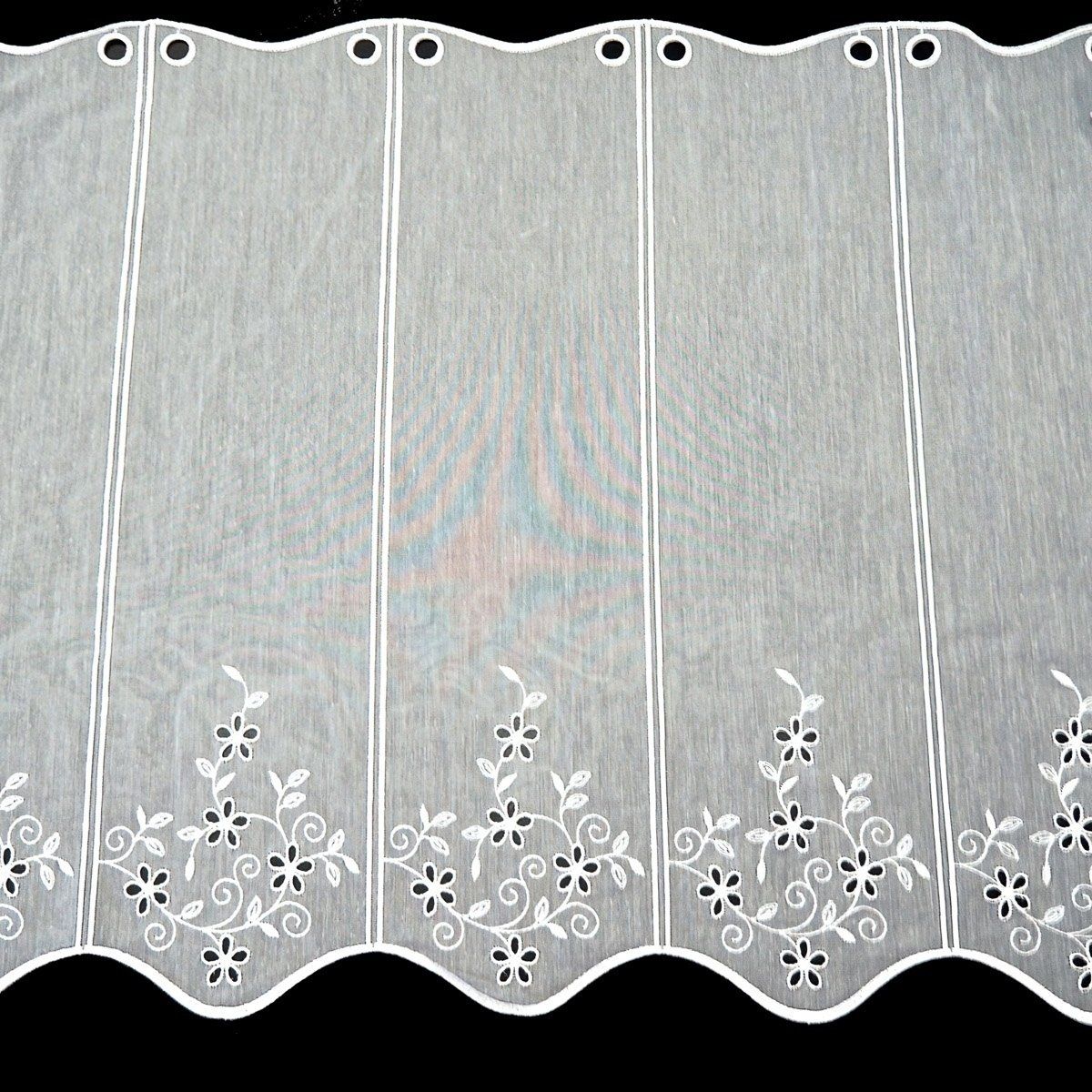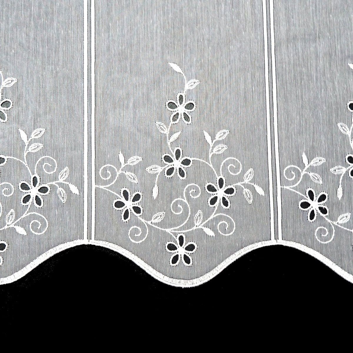 Metrážová voálová vitrážová záclona s vyšívanými květy ve spodní části na bílém podkladě, s bordurou zakončenou obloučky. Záclona je vyrobena ze 100% polyesteru v a je dostupná v různých výškách. Výška záclony je měřena v nejdelším místě. Záclona po ustřižení je již zapravená, šířka jednoho pole je cca 15cm. Šířku záclony zadejte do kolonky "Množství"