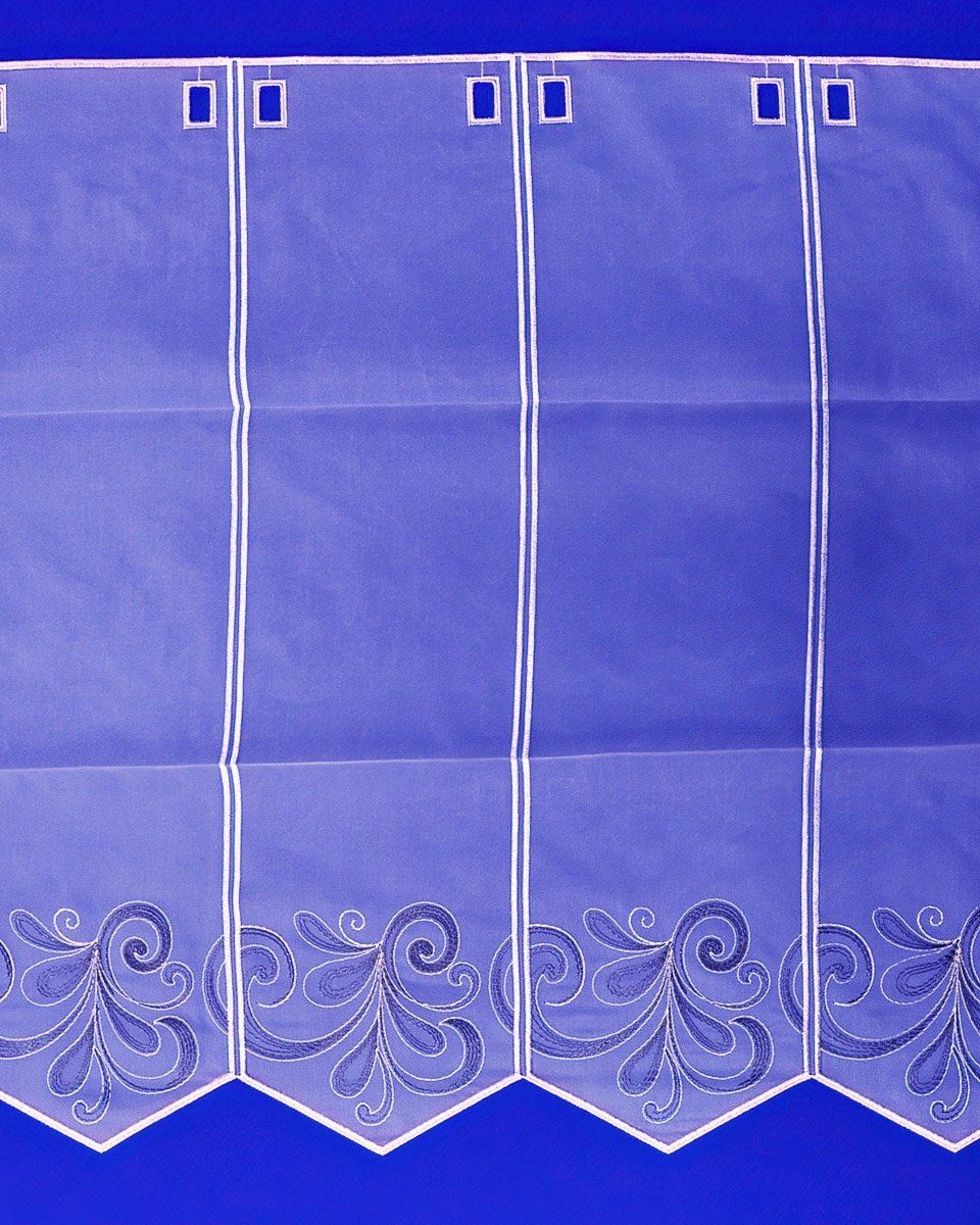 Metrážová voálová vitrážová záclona s vyšívaným ornamentem v černošedé barvě na bílém pozadí, s bordurou zakončenou špičkami. Záclona je vyrobena ze 100% polyesteru v a je dostupná v různých výškách. Výška záclony je měřena v nejdelším místě. Záclona po ustřižení je již zapravená, šířka jednoho pole je cca 15cm. Šířku záclony zadejte do kolonky "Množství"