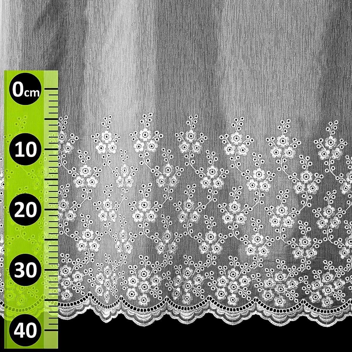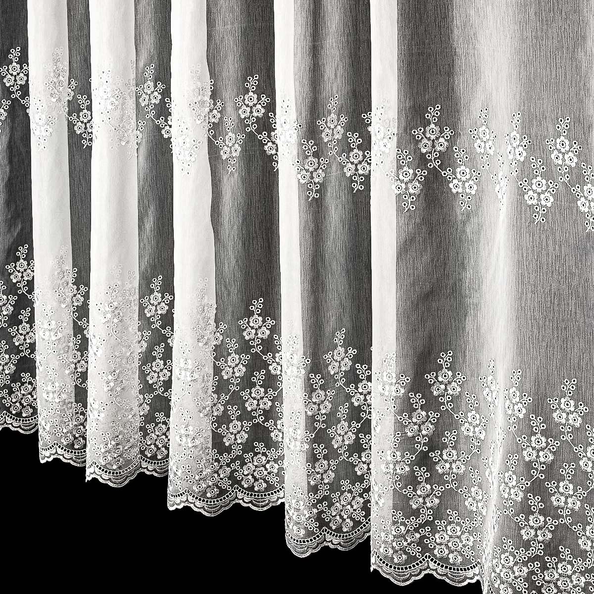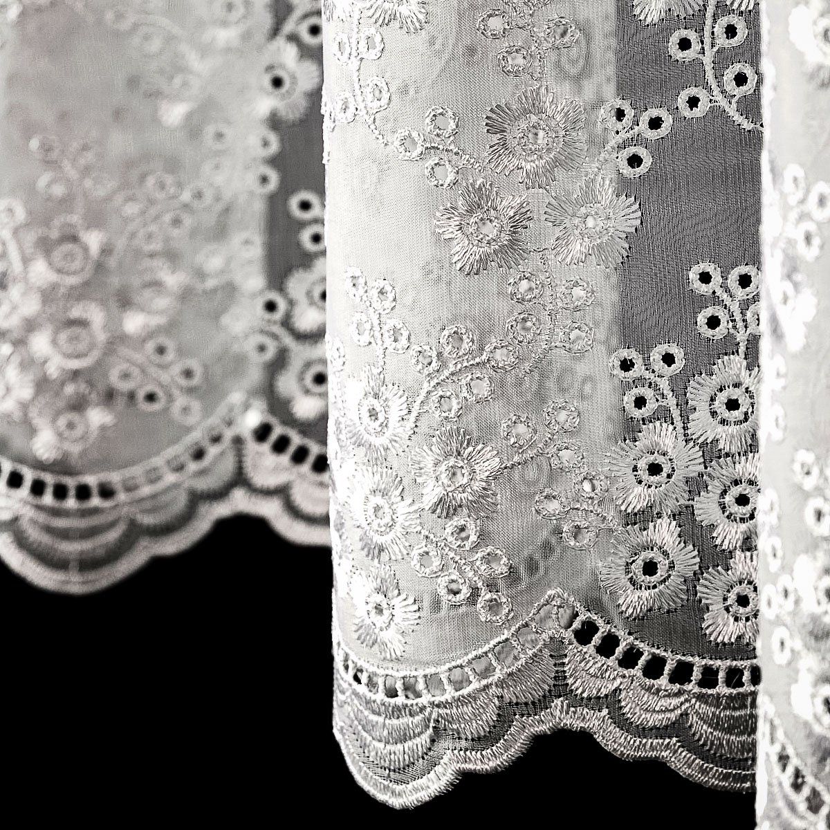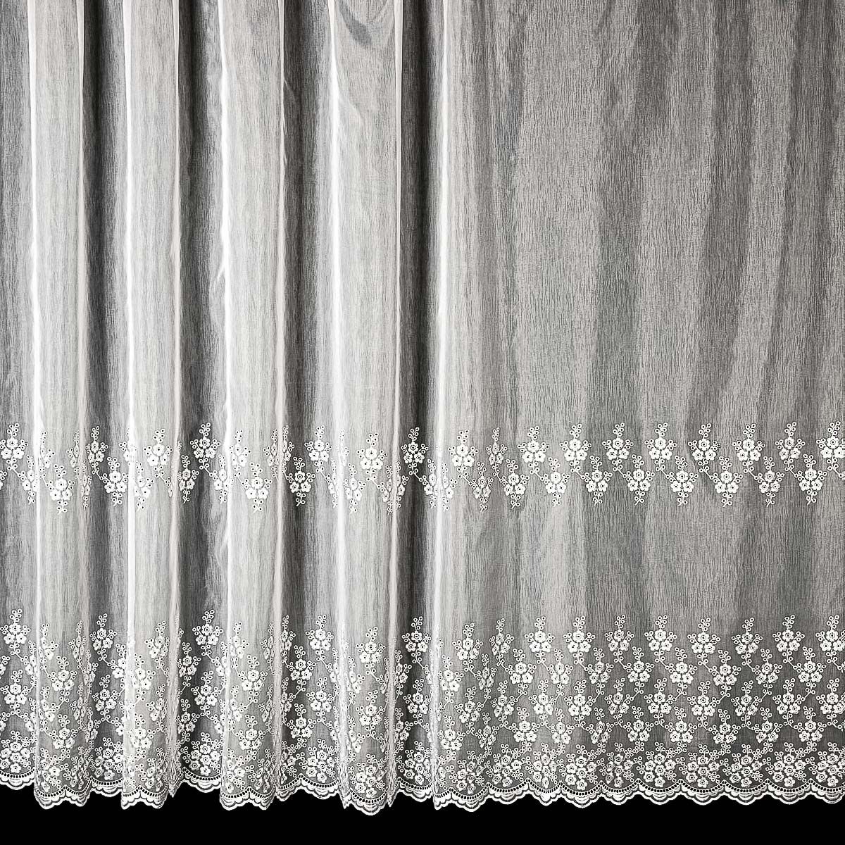 Metrážová voálová záclona v bílé barvě s dvěma vodorovnými pruhy s vyšívanými květinkami v bílé barvě, s ozdobnou bordurou. Záclona je vyrobena ze 100% polyesteru a je dostupná v různých výškách. Výška záclony je měřena v nejdelším místě. Šířku záclony zadejte do kolonky "Množství"