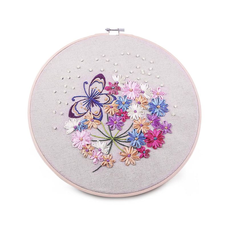 Sada na vyšívání s motivem růžových a fialových květů s motýlem. Vyšívá se na předtištěnou tkaninu pomocí příze mouline (mulinka). Vyšívací sada obsahuje vyšívací tkaninu s předlohou, sadu barevných přízí a stužek, obrázkový návod, vyšívací jehly a dřevěný, bambusový vyšívací kruh o průměru 26,5cm, který použijete jako rámeček pro hotový obrázek.