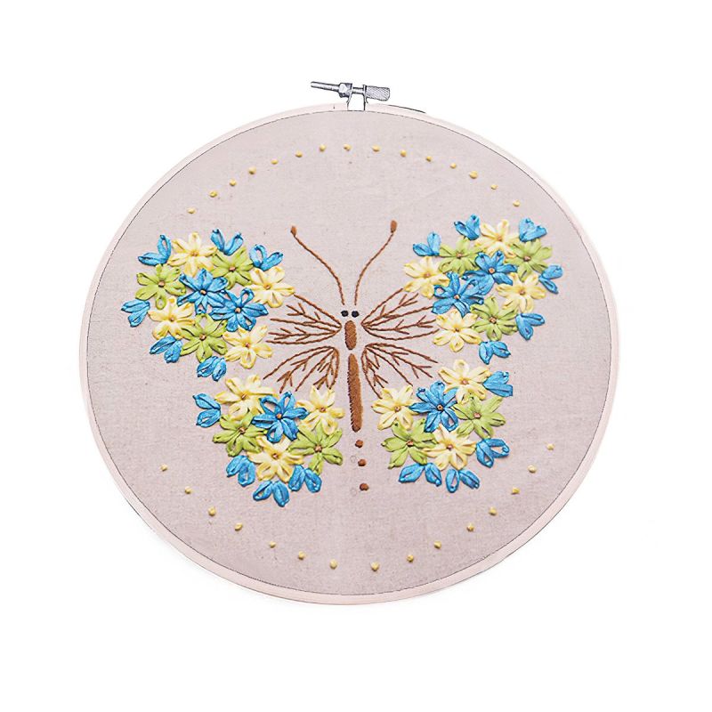 Sada na vyšívání s motivem žlutých a modrých květů tvořících vzor motýla. Vyšívá se na předtištěnou tkaninu pomocí příze mouline (mulinka). Vyšívací sada obsahuje vyšívací tkaninu s předlohou, sadu barevných přízí a stužek, obrázkový návod, vyšívací jehly a dřevěný, bambusový vyšívací kruh o průměru...