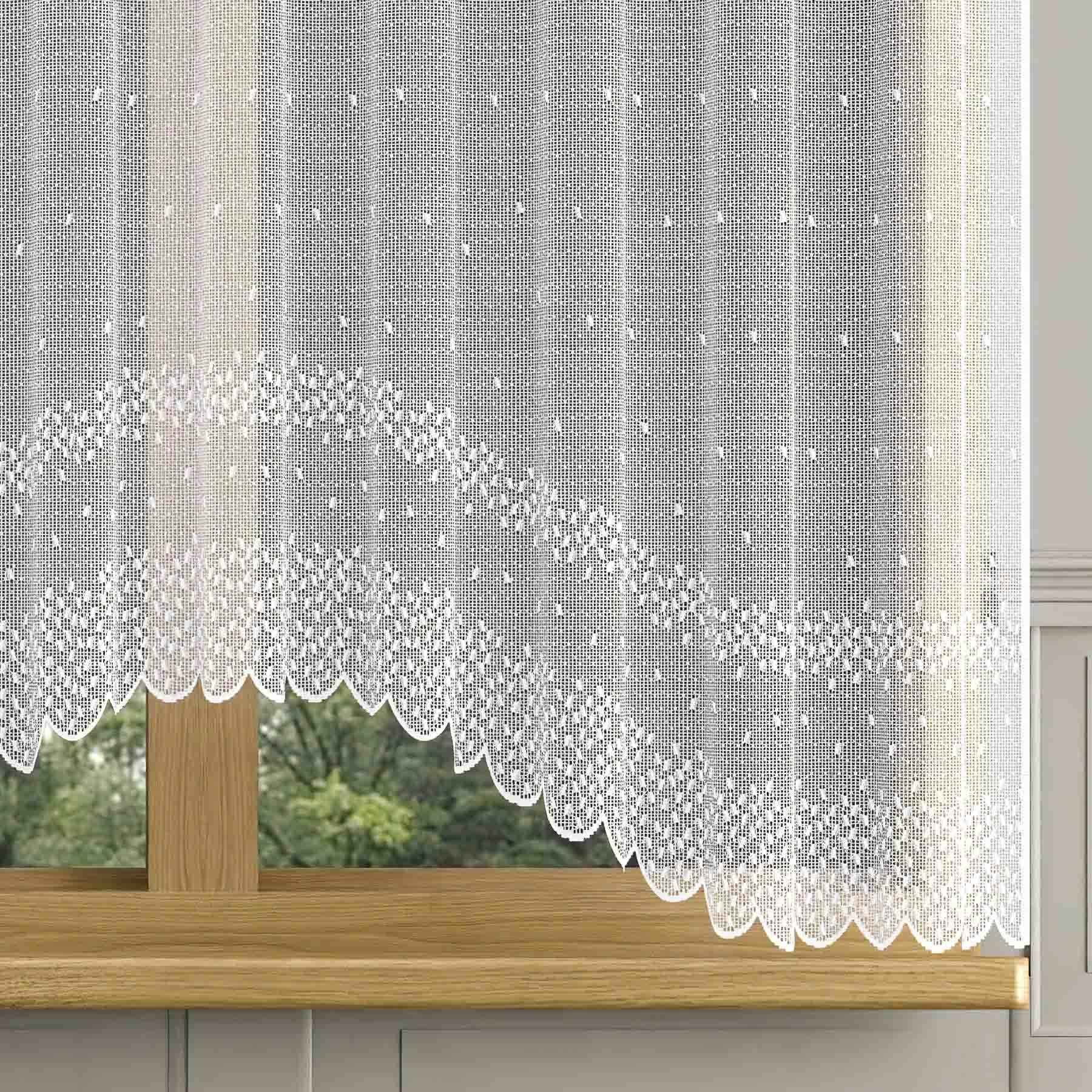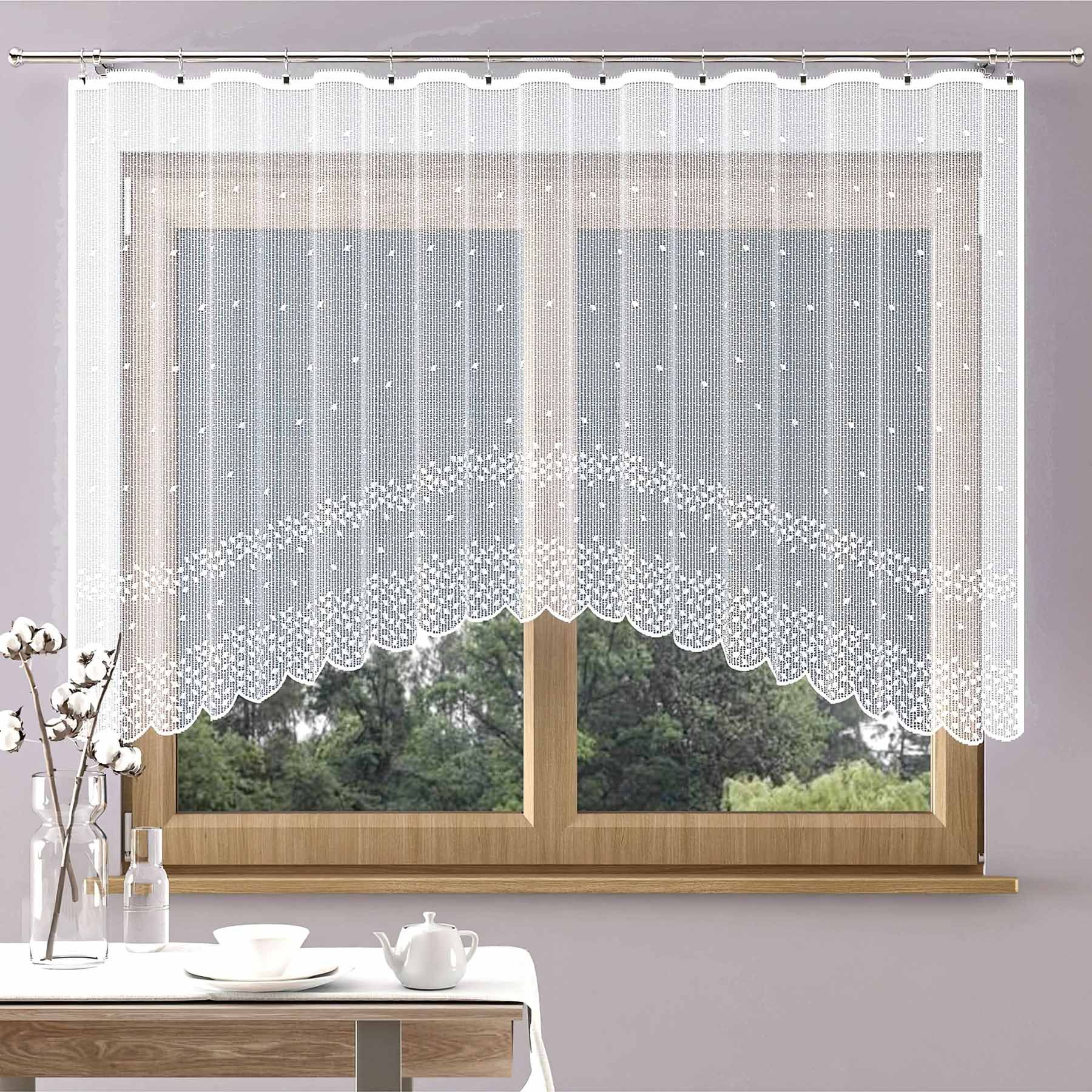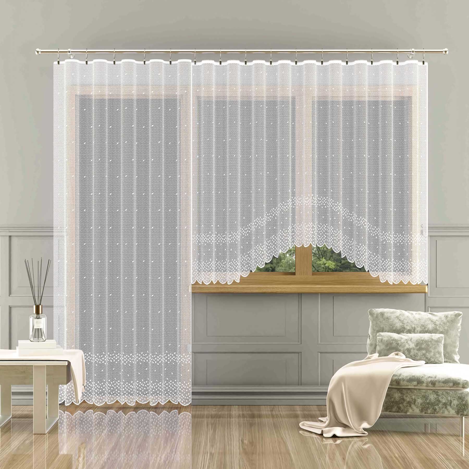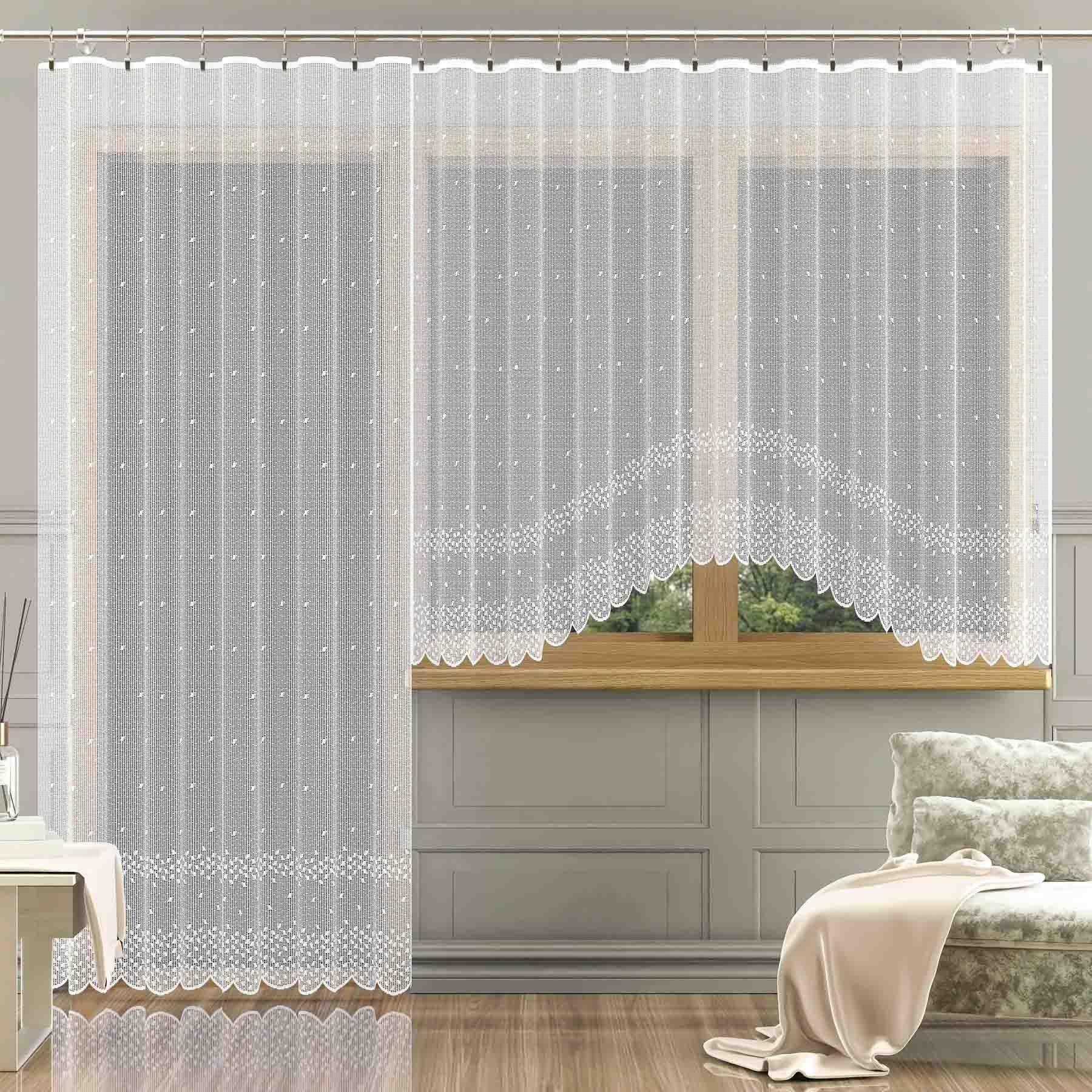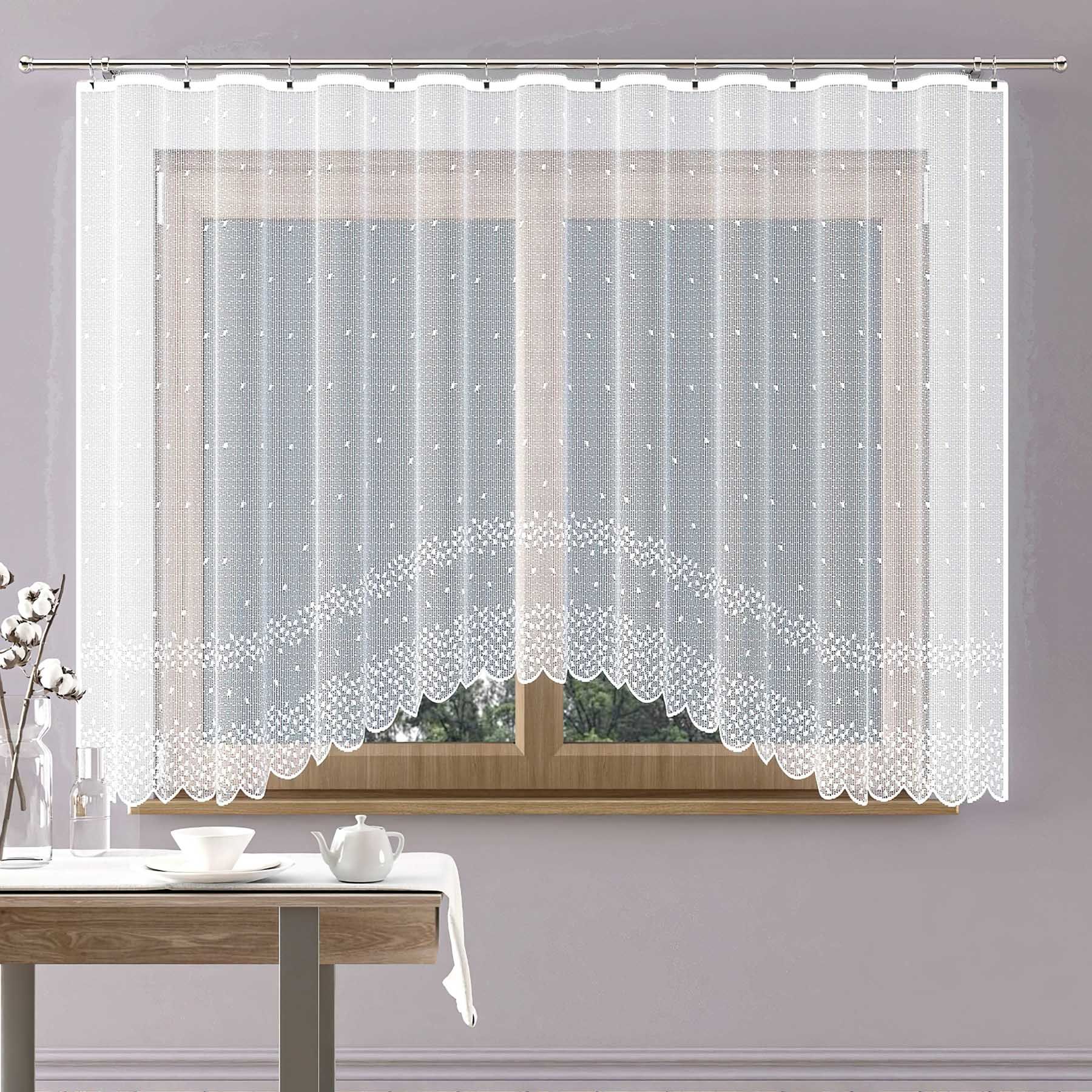 Hotová žakárová záclona se vzorem kostiček v jednobarevné bílé barvě, oblouková, zakončená bordurou. Záclona je vyrobena ze 100% polyesteru v různých výškách a šířkách. Záclona má z výroby pevné boční i horní okraje, bez řasící stužky. Výška záclony je měřena v nejdelším místě.