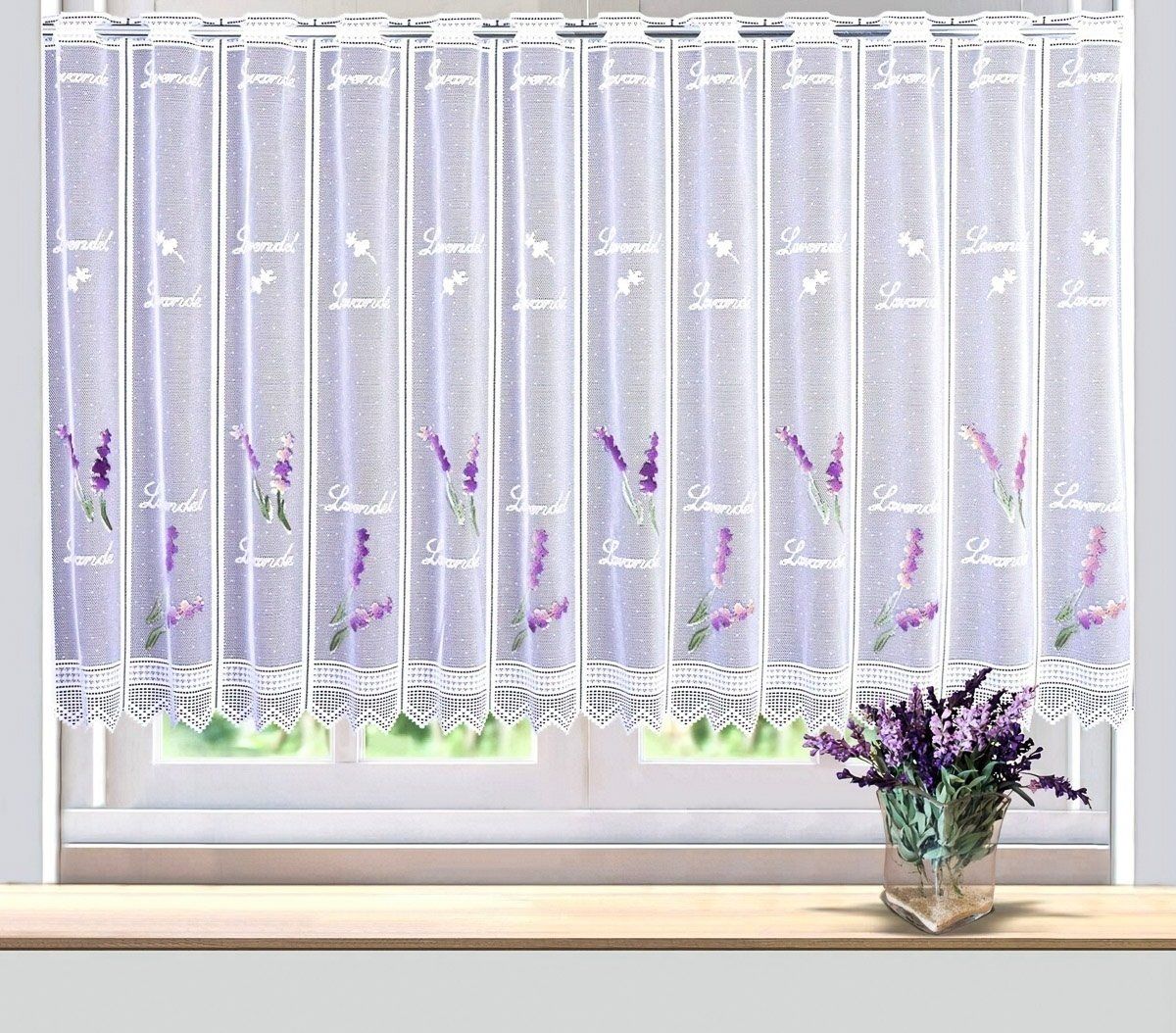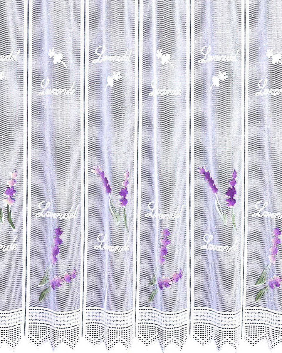 Metrážová žakárová vitrážová záclona tkaná do panelů se vzorem levandulí a nápisů levande na bílém podkladě. Záclona má v horní části pevný okraj s dírkami pro navlečení na tyč. Jeden panel má šířku cca 15cm, po ustřižení je záclona již zapravená. Záclona je vyrobena ze 100% polyesteru a je dostupná v různých výškách. Výška záclony je měřena v nejdelším místě. Šířku záclony zadejte do kolonky "Množství"